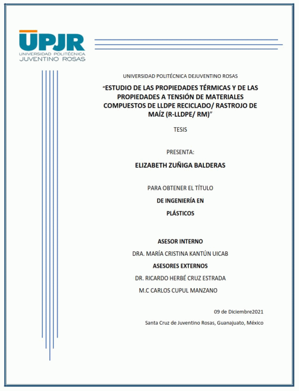 Estudio de las propiedades térmicas y de las propiedades a tensión de materiales compuestos de LLDP Reciclado/Rastrojo de Maíz(R-LLDPE/RM) [recurso electrónico] / Elizabeth Zúñiga Balderas