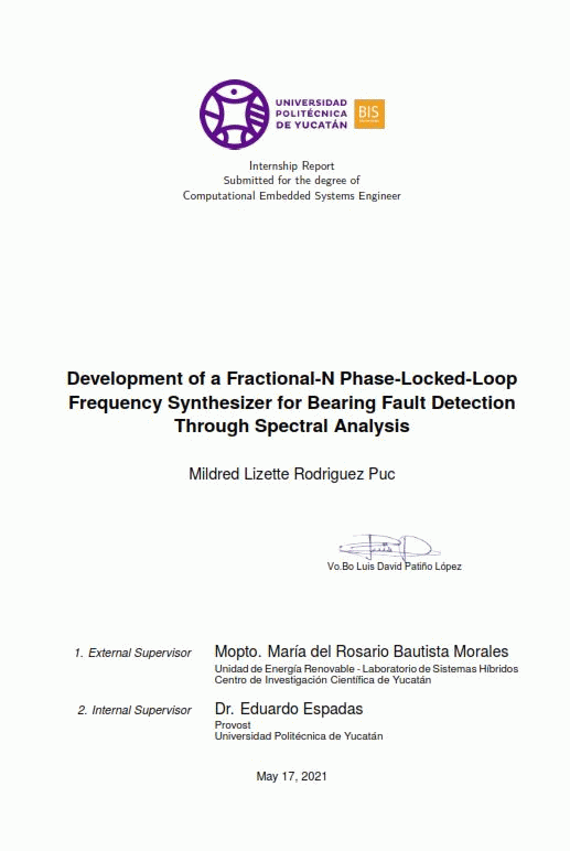 Development of a fractional-N phase-locked-loop frequency synthesizer for bearing fault detection through spectral analysis [recurso electrónico] / Mildred Lizette Rodriguez Puc