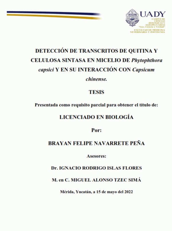 Descripción de transcritos de quitina y celulosa sintasa en micelio de Phytophtora capsici y en su interacción con Capsicum chinense [recurso electrónico] / Brayan Felipe Navarrete Peña