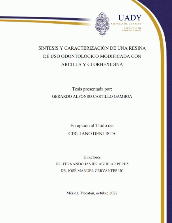 Síntesis y caracterización de una resina de uso odontológico modificada con arcilla y clorhexidina [recurso electrónico] / Gerardo Alonso Castillo Gamboa