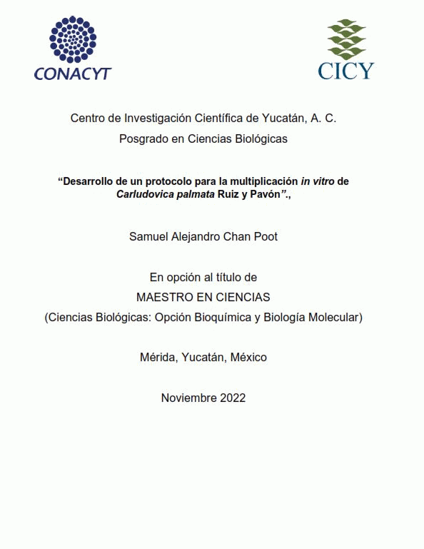 Desarrollo de un protocolo para la multiplicación in vitro de Carludovica palmata Ruíz y Pavón [recurso electrónico] / Samuel Alejandro Chan Poot