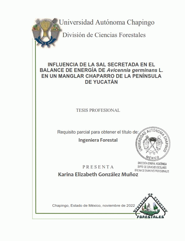 Influencia de la sal secretada en el balance de energía de Avicennia germinans L. en un manglar chaparro de la península de Yucatán [recurso electrónico] / Karina Elizabeth González Muñoz