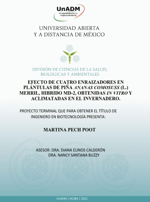 Efecto de cuatro enraizadores en plántulas de piña Ananas comosus (L.) merril, hibrido md-2, obtenidas in vitro y aclimatadas en el invernadero [recurso electrónico] / Martina Pech Poot
