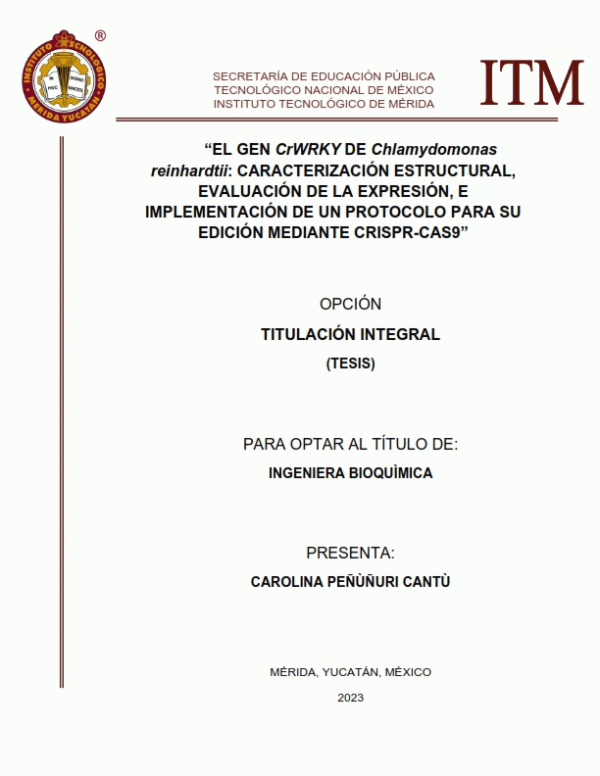 El gen CrWRKY de Chlamydomonas reinhardtii: caracterización estructural, evaluación de la expresión, e implementación de un protocolo para su edición mediante CRISPR-CAS9 [recurso electrónico] / Carolina Peñúñuri Cantú