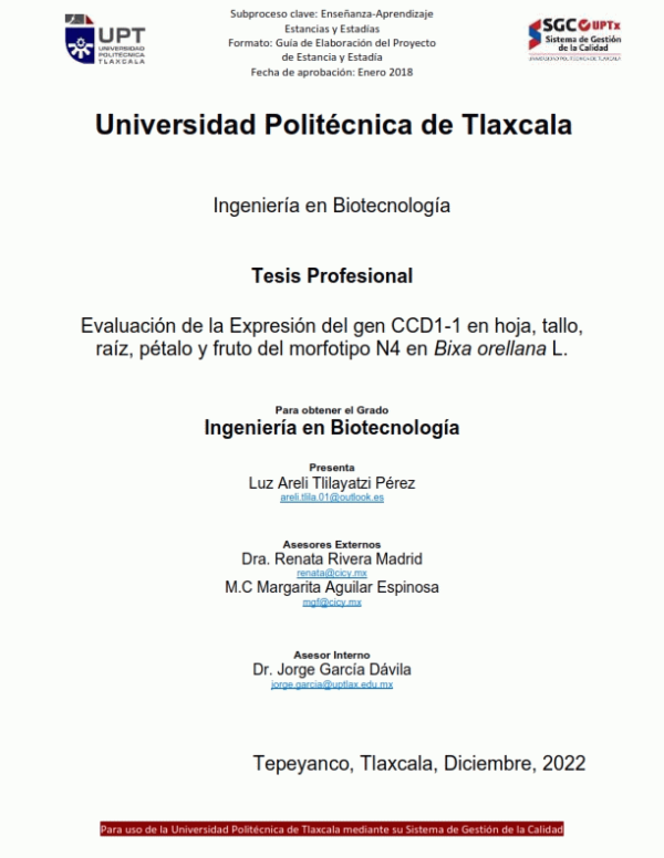 Evaluación de la Expresión del gen CCD1-1 en hoja, tallo, raíz, pétalo y fruto del morfotipo N4 en Bixa orellana L. [recurso electrónico] / Luz Areli Tlilayatzi Pérez
