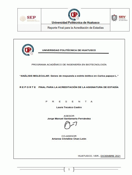 Análisis molecular [recurso electrónico] : genes de respuesta a estrés biótico en Carica papaya L. / Laura Tecalco Castro