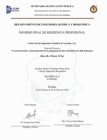 Caracterización y determinación de la pungencia de dos variedades de chile habanero (Boox Ik y Mayan K'iin) [recurso electrónico] / Renata Valentina Palma Solís