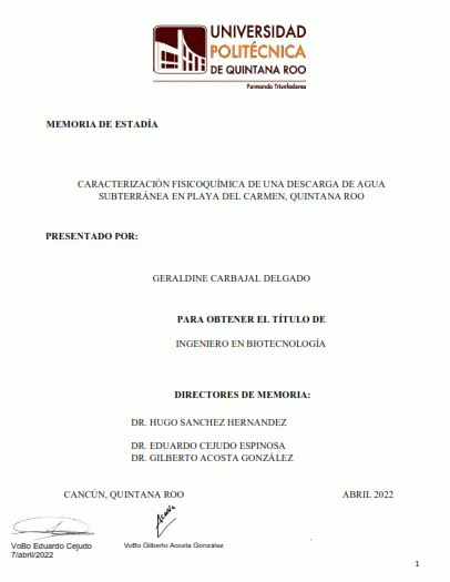 Caracterización fisicoquímica de una descarga de agua subterránea en Playa del Carmen, Quintana Roo [recurso electrónico] / Geraldine Carbajal Delgado