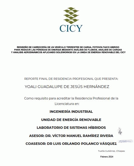 Rediseño de carrocería de un vehículo terrestre de carga, fotovoltaico hibrido para reducir las pérdidas de energía mediante análisis de fluidos, análisis de cargas y análisis aerodinámicos aplicando SOLIDWORKS en la Unidad de Energía Renovable del CICY [recurso electrónico] / Yoali Guadalupe de Jesús Hernández