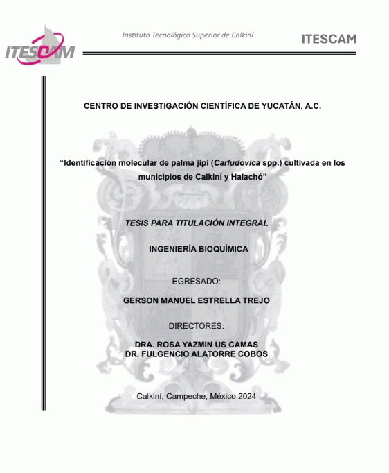 Identificación molecular de palma jipi (Carludovica spp.) cultivada en los municipios de Calkiní y Halachó / Gerson Manuel Estrella Trejo [recurso electrónico]