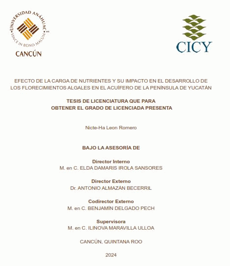 Efecto de la carga de nutrientes y su impacto en el desarrollo de los florecimientos algales en el acuífero de la Península de Yucatán [recurso electrónico] / Nicte-Ha León Romero