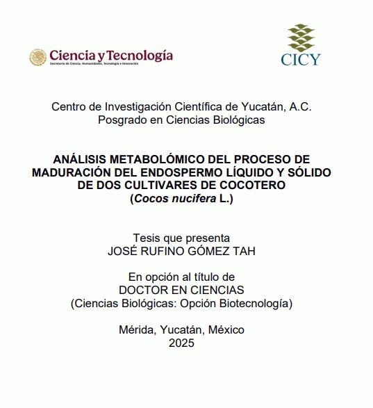 Análisis metabolómico del proceso de maduración del endospermo líquido y sólido de dos cultivares de cocotero (Cocos nucifera L.). José Rufino Gómez Tah. [recurso electrónico] /