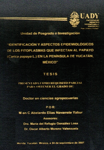 Identificación y aspectos epidemiológicos de los fitoplasmas que infectan al papayo (Carica papaya L.) en la Península de Yucatán, México / Abelardo Elías Navarrete Yabur
