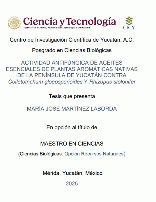 Actividad antifúngica de aceites esenciales de plantas aromáticas nativas de la Península de Yucatán contra Colletotrichum gloeosporioides y Rhizopus stolonifer María José Martínez Laborda. [recurso electrónico] /