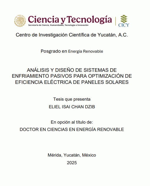 Análisis y diseño de sistemas de enfriamiento pasivos para optimización de eficiencia eléctrica de paneles solares. Eliel Isai Chan Dzib. [recurso electrónico] /
