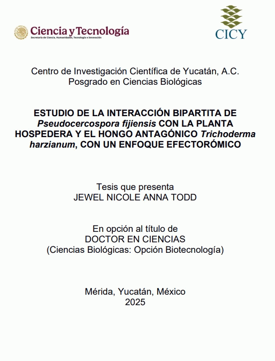 Estudio de la interacción bipartita de Pseudocercospora fijiensis con la planta hospedera y el hongo antagónico Trichoderma harzianum, con un enfoque efectorómico Jewel Nicole Anna Todd. [recurso electrónico] /