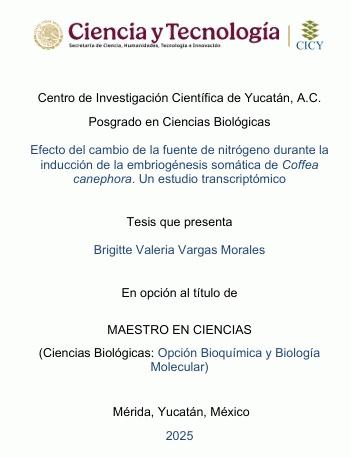 Efecto del cambio de la fuente de nitrógeno durante la inducción de la embriogénesis somática de Coffea canephora. Un estudio transcriptómico Brigitte Valeria Vargas Morales. [recurso electrónico] /