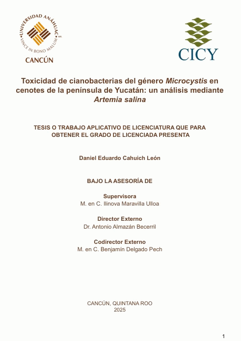 Toxicidad de cianobacterias del género Microcystis en cenotes de la península de Yucatán : un análisis mediante Artemia salina Daniel Eduardo Cahuich León. [recurso electrónico] /