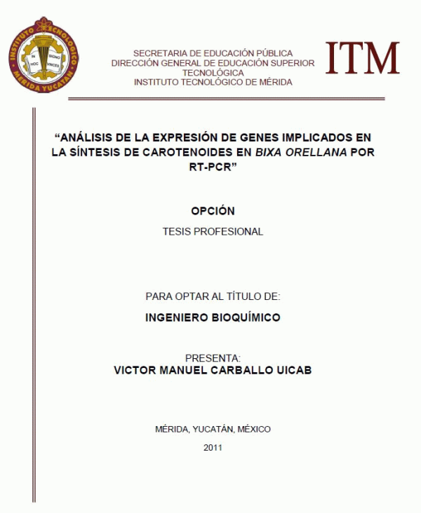 Análisis de la expresión de genes implicados en la síntesis de carotenoides en Bixa orellana por RT-PCR [recurso electrónico] / Víctor Manuel Carballo Uicab