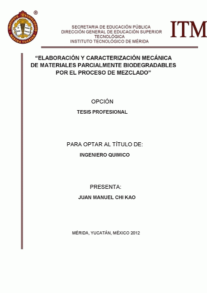 Elaboración y caracterización mecánica de material parcialmente biodegradable por el proceso de mezclado [recurso electrónico] / Juan Manuel Chi Kao