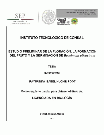 Estudio preliminar de la floración, la formación del fruto y la germinación de Brosimum alicastrum [recurso electrónico] / Raymunda Isabel Huchin Poot