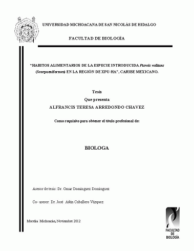 Hábitos alimentarios de la especie introducida Pterois volitans (Scorpaeniformes) en la región de Xpu-Ha, caribe mexicano [recurso electrónico] / Alfrancis Teresa Arredondo Chávez