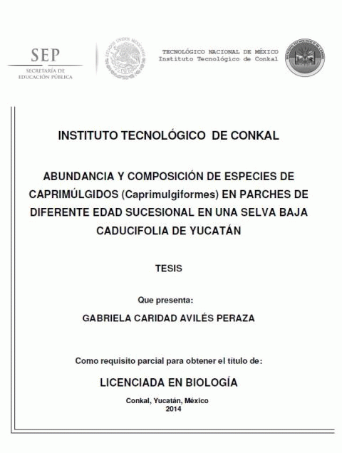 Abundancia y composición de especies de caprimúlgidos (Caprimulgiformes) en parches de diferente edad sucesional en una selva baja caducifolia de Yucatán [recurso electrónico] / Gabriela Caridad Avilés Peraza