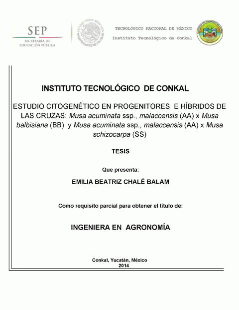 Estudio citogenético en progenitores e híbridos de las cruzas : Musa acuminata ssp., malaccensis (AA) x Musa balbisiana (BB) y Musa acuminata ssp., malaccensis (AA) x Musa schizocarpa (SS) [recurso electrónico] / Emilia Beatriz Chalé Balam