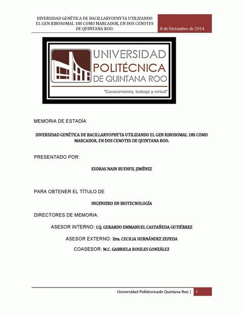Diversidad genética de Bacillaryophyta utilizando el gen ribosomal 18s como marcador en dos cenotes de Quintana Roo [recurso electrónico] / Esdras Nain Buenfil Jiménez