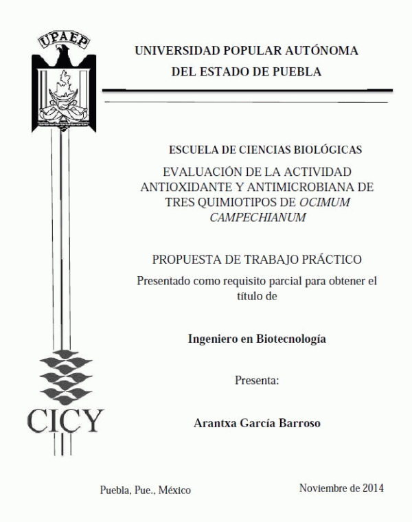 Evaluación de la actividad antioxidante y antimicrobiana de tres quimiotipos de Ocimum campechianum [recurso electrónico] / Arantxa García Barroso