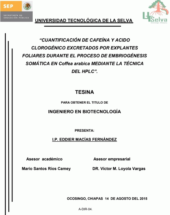 Cuantificación de cafeína y ácido clorogénico excretados por explantes foliares durante el proceso de embriogénesis somática en Coffea arabica mediante la técnica del HPLC [recurso electrónico] / Eddier Macías Fernández