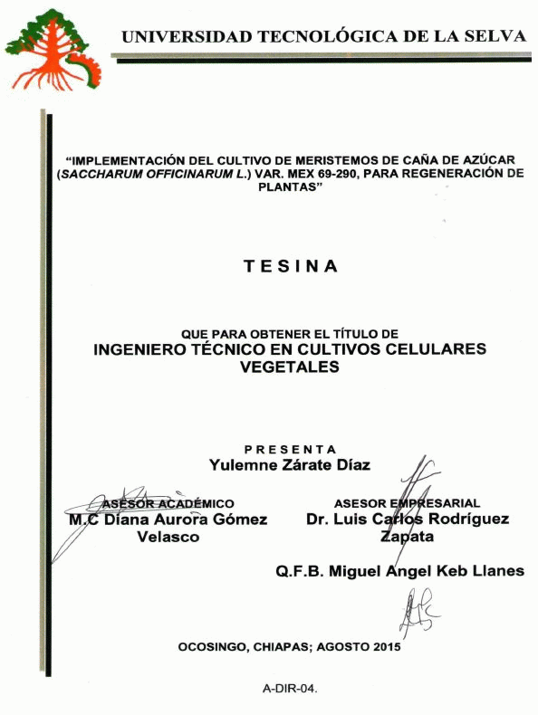 Implementación del cultivo de meristemos de caña de azúcar (Saccharum officinarum) var. Mex 69-290, para regeneración de plantas [recurso electrónico] / Yulemne Zárate Díaz