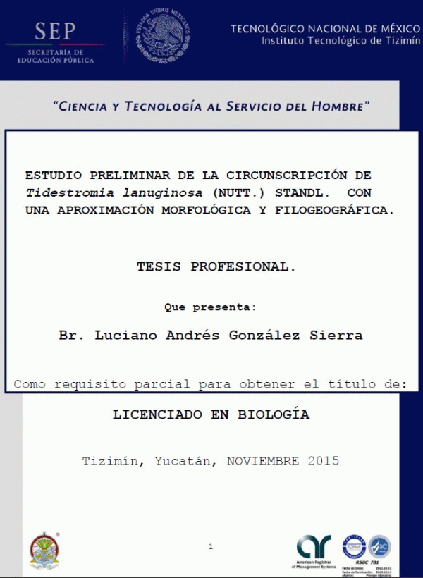 Estudio preliminar de la circunscripción de Tidestromia lanuginosa (Nutt.) standl. con una aproximación morfológica y filogeográfica [recurso electrónico] / Luciano Andrés González Sierra