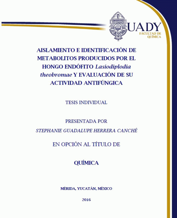 Aislamiento e identificación de metabolitos producidos por el hongo endófito Lasiodiplodia theobromae y evaluación de su actividad antifúngica [recurso electrónico] / Stephanie Guadalupe Herrera Canché