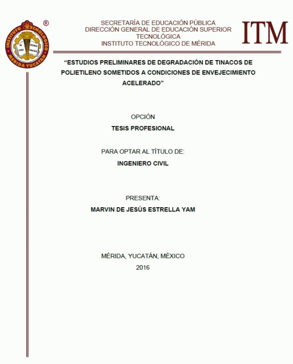Estudios preliminares de degradación de tinacos de polietileno sometidos a condiciones de envejecimiento acelerado [recurso electrónico] / Marvin de Jesús Estrella Yam