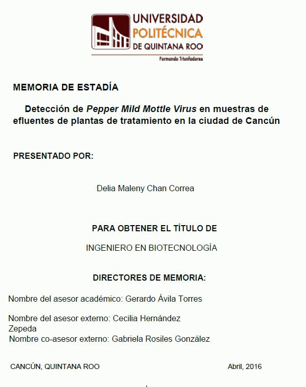 Detección del virus Pepper Mild Mottle Virus en muestras de efluentes de plantas de tratamiento en la ciudad de Cancún [recurso electrónico] / Delia Maleny Chan Correa