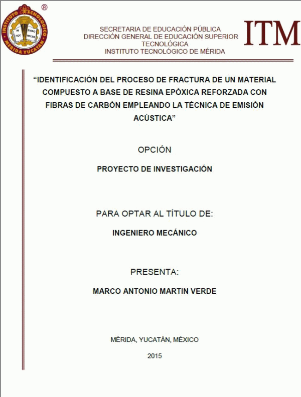 Identificación del proceso de fractura de un material compuesto a base de resina epóxica reforzada con fibras de carbón empleando la técnica de emisión acústica [recurso electrónico] / Marco Antonio Martín Verde