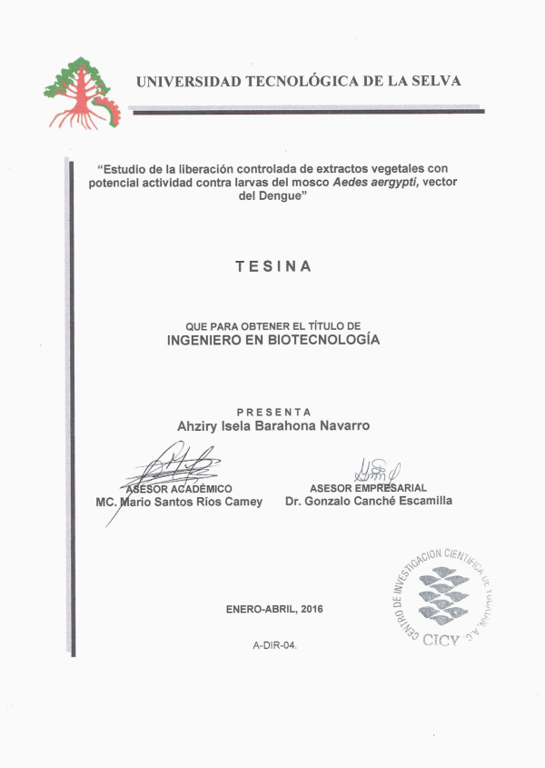 Estudio de la liberación controlada de extractos vegetales con potencial actividad contra larvas del mosco Aedes aergypti, vector del dengue [recurso electrónico] / Ahziry Isela Barahona Navarro