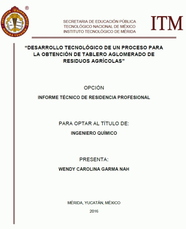 Desarrollo tecnológico de un proceso para la obtención de tablero aglomerado de residuos agrícolas [recurso electrónico] / Wendy Carolina Garma Nah