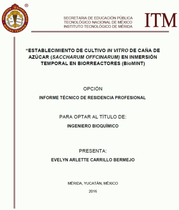 Establecimiento de cultivo in vitro de caña de azúcar (Saccharum offcinarum) en inmersión temporal en biorreactores (BioMINT) [recurso electrónico] / Evelyn Arlette Carrillo Bermejo