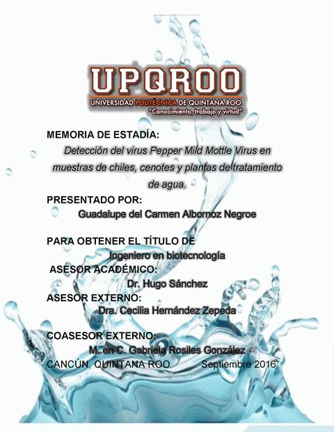 Detección del virus Pepper Mild Mottle Virus en muestras de chiles, cenotes y plantas de tratamiento de agua [recurso electrónico] / Guadalupe del Carmen Albornoz Negroe