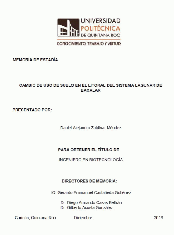 Cambio de uso de suelo en el litoral del sistema lagunar de Bacalar [recurso electrónico] / Daniel Alejandro Zaldívar Méndez