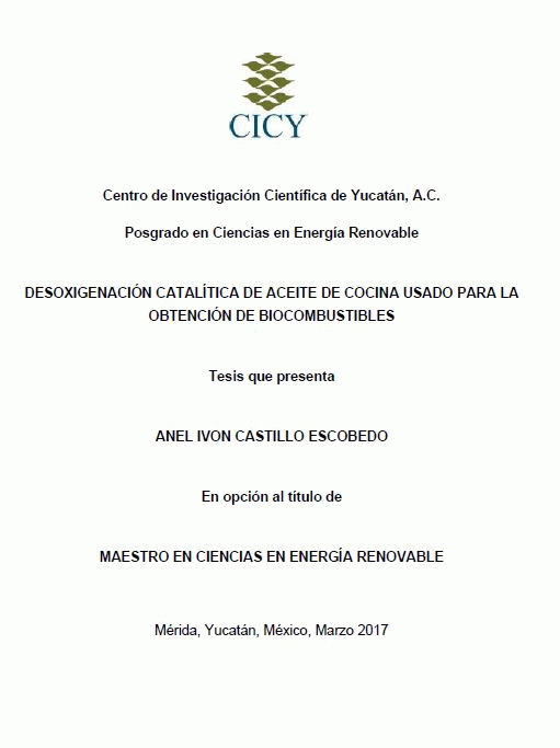 Desoxigenación catalítica de aceite de cocina usado para la obtención de biocombustible [recurso electrónico] / Anel Ivon Castillo Escobedo