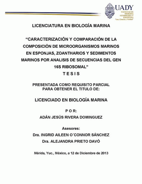 Caracterización de comparación de la composición de microorganismos marinos en esponjas, zoantharios y sedimentos marinos por análisis de secuencias del gen 16s ribosomal [recurso electrónico] / Adán Jesús Rivera Domínguez