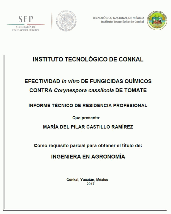 Efectividad in vitro de fungicidas químicos contra Corynespora cassicola de tomate [recurso electrónico] / María del Pilar Castillo Ramírez