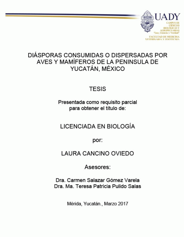 Diásporas consumidas o dispersadas por aves y mamíferos de la Península de Yucatán, México [recurso electrónico] / Laura Cancino Oviedo