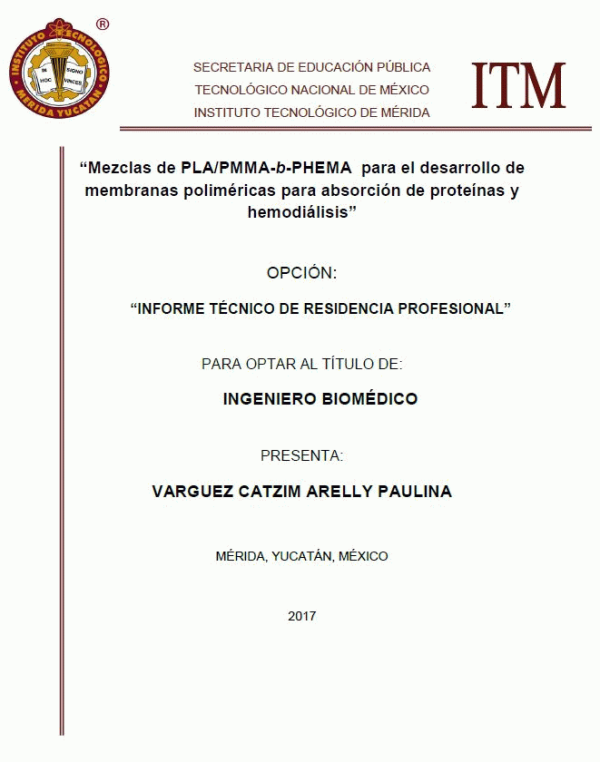 Mezclas de PLA/PMMA-B-PHEMA para el desarrollo de membranas poliméricas para absorción de proteínas y hemodiálisis [recurso electrónico] / Arelly Paulina Varguez Catzim