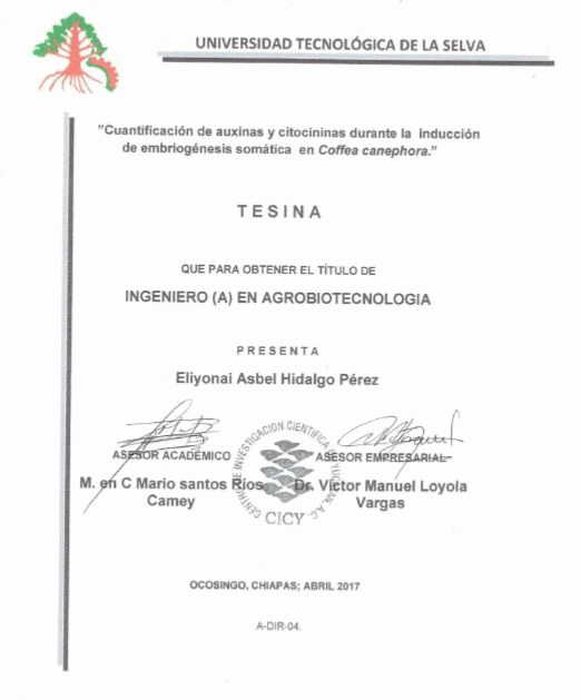 Cuantificación de auxinas y citocininas durante la inducción de la embriogénesis somática en Coffea canephora [recurso electrónico] / Eliyonai Asbel Hidalgo Pérez
