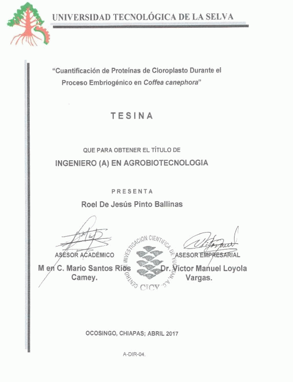 Cuantificación de proteínas de cloroplasto durante el proceso embriogénico en Coffea canephora [recurso electrónico] / Roel de Jesús Pinto Ballinas