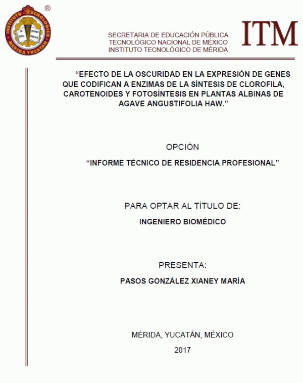 Efecto de la oscuridad en la expresión de genes que codifican a enzimas de la síntesis de clorofila, carotenoides y fotosíntesis en plantas albinas de Agave angustifolia Haw [recurso electrónico] / Xianey María Pasos González